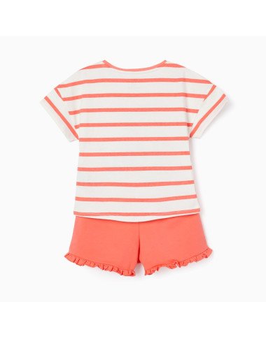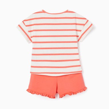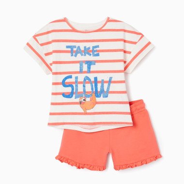 ZIPPY kostiumėlis mergaitei (3/4-11/12 m.). Kostiumėlio su marškinėliais trumpomis rankovėmis ir šortukais mergaitei rinkinys - nerūpestingai ir nuotykių pilnai vasarai! Kostiumėlis pagamintas iš medvilnės. Marškinėliai įdomesnio modelio - nuleista pečių juosta, dryžuoti su spauda priekyje, šortukai su nedideliais raukinukais, gumyte ir raištukais juosmens srityje.