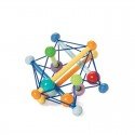 Gražių spalvų ir formų medinis žaislas. Patogu jį paimti ir laikyti, galima mėtyti, barškinti, todėl tinka ir visai mažiems kūdikiams.