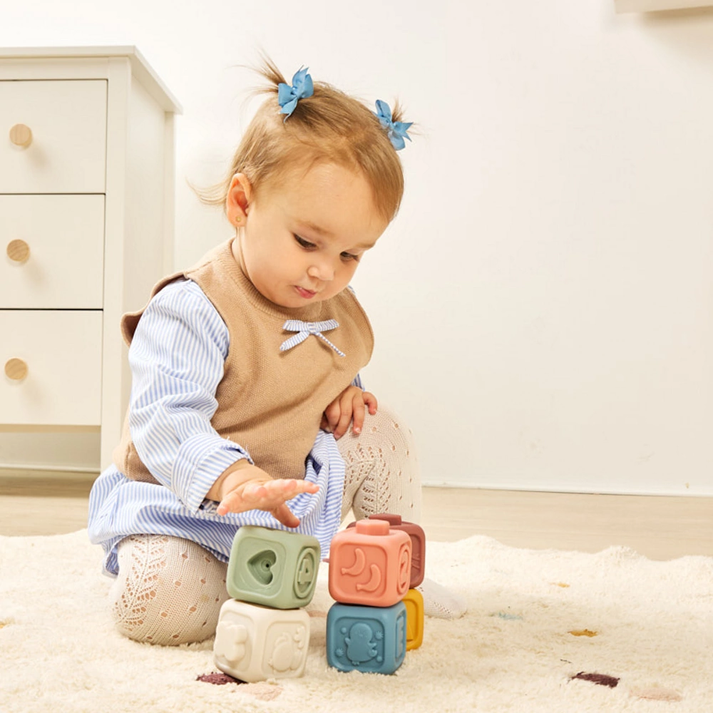 2. Kadangi nuo 6 mėnesių kūdikiai lengviau suima daiktus, o jų koordinacija žymiai geresnė, vienas pagrindinių žaidimų įrankių - kaladėlės. Mes rekomenduojame Miniland sensorines kaladėles arba pirmąsias Picotons kaladėles. Abi kaladėlės turi sensorinius paviršius, todėl mažyliui patiks jas liesti ir tyrinėti pirštukais