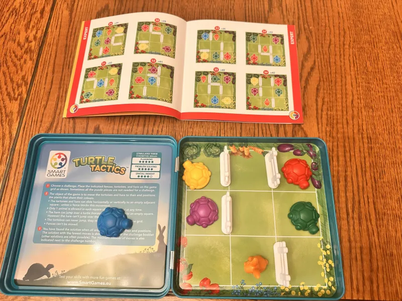 Loginis žaidimas Turtle Tactics. Omnomnom, gėlės ir žolė kitoje tvoros pusėje atrodo skanesnė ir žalesnės! Padėkite nueiti šiems vėžliukams prie jų mėgstamiausio maisto pagal jų spalvą. Įdomus nuoseklus žaidimas, pateikiamas patogioje metalinėje kelioninėje dėžutėje.